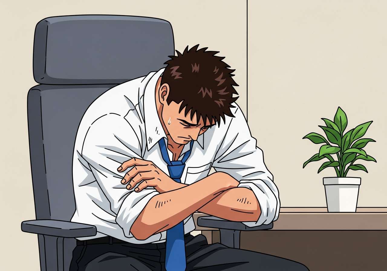 彼女は前かがみの姿勢で座り、床を見つめていた。