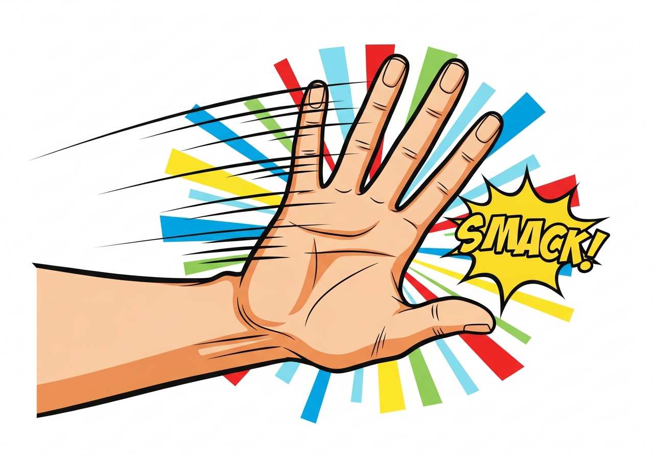 平手や手の甲で強く叩くこと。また、唇を鳴らす音や、何かが強くぶつかる音を表す。