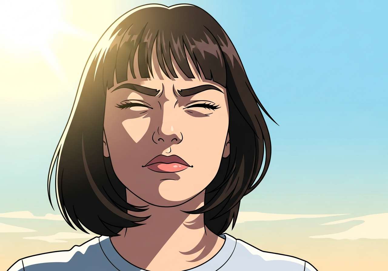 目を細めて見ること、または斜視の状態を表す動詞・名詞。まぶしい光や遠くのものを見るときによく使われます。