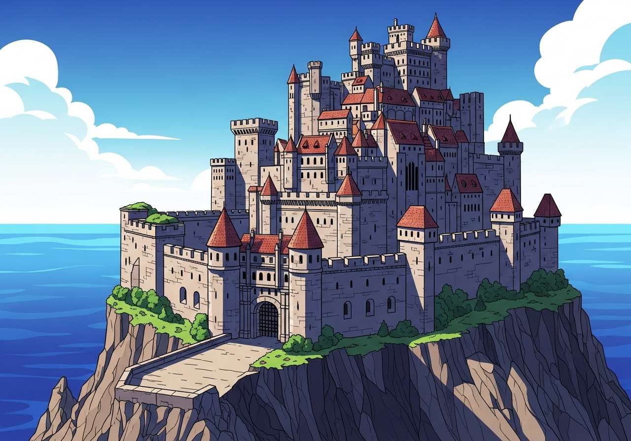 古代の要塞は丘の上にそびえ立ち、下の村を守っていた。