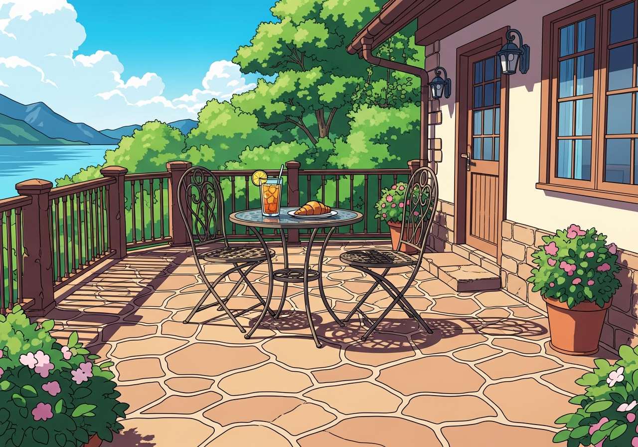 建物の外に張り出した平らな床面、または段々になった土地を指します。屋外でくつろいだり、景色を楽しむための空間として使われます。