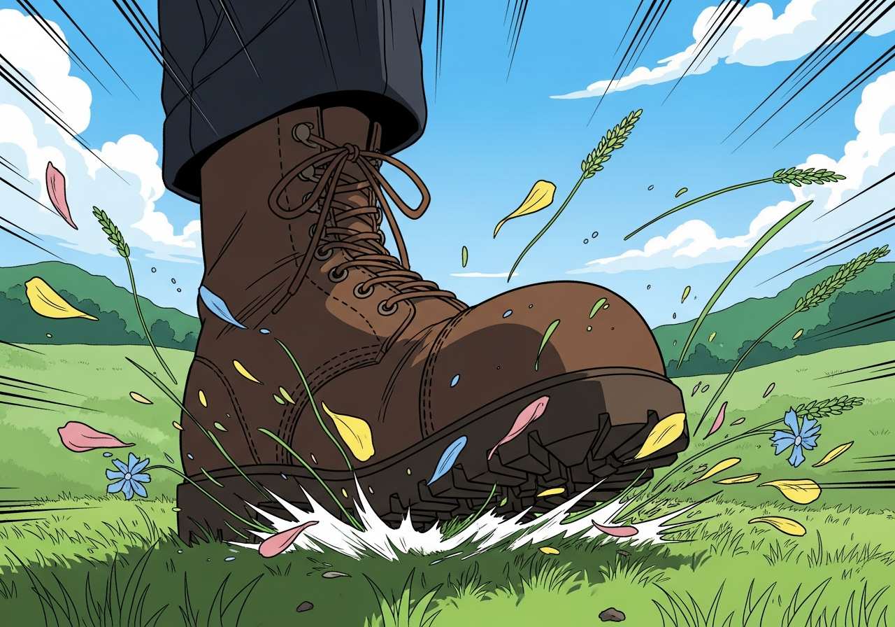 足で強く踏みつける、または踏み荒らすことを意味する動詞。物理的に何かを踏みつぶす場合や、比喩的に権利や感情を無視する場合にも使われます。