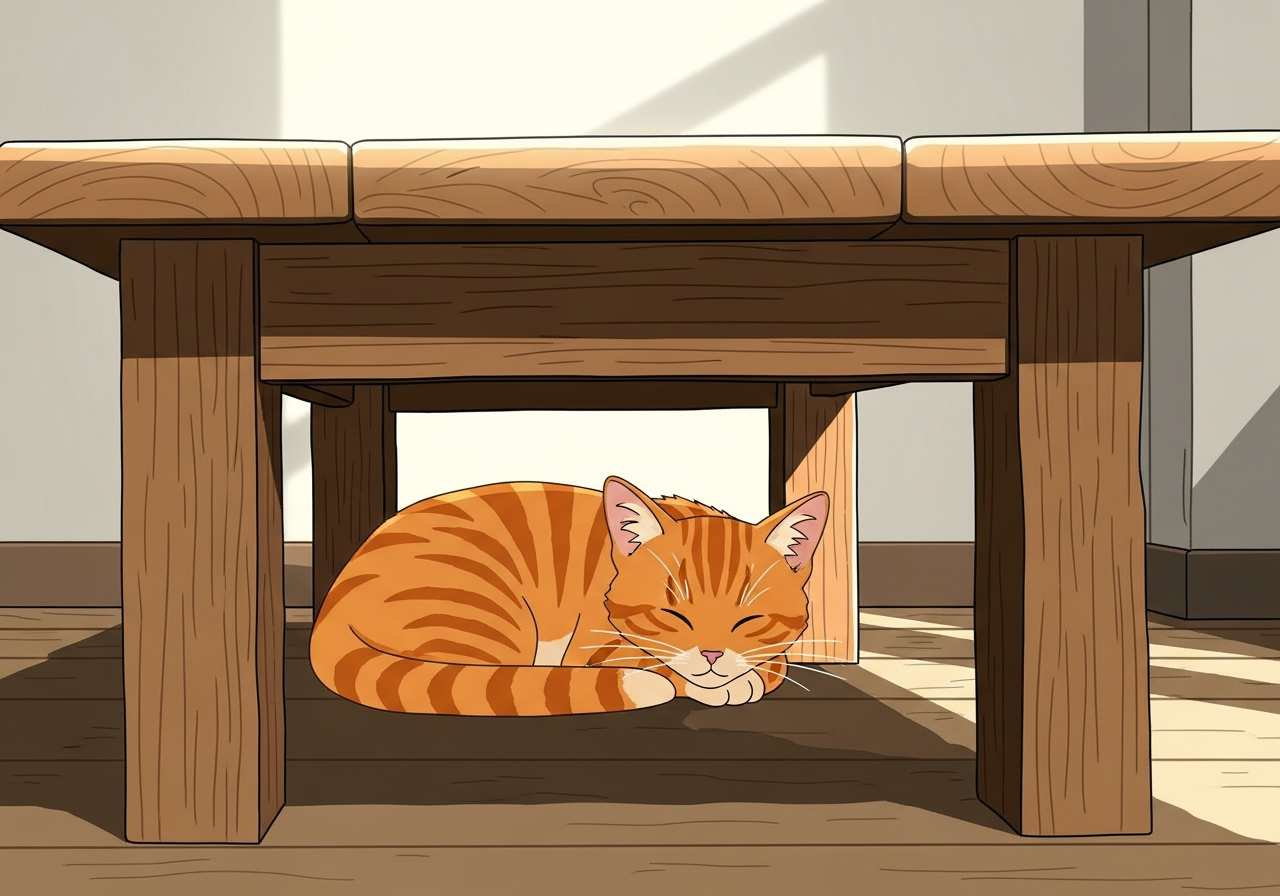 猫がテーブルの下に隠れている。