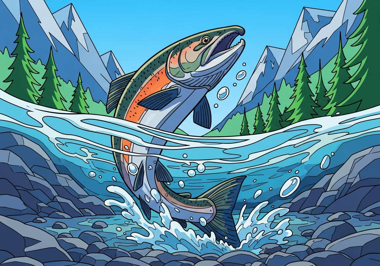 サケは産卵場所に到達するために上流へ泳ぐ。