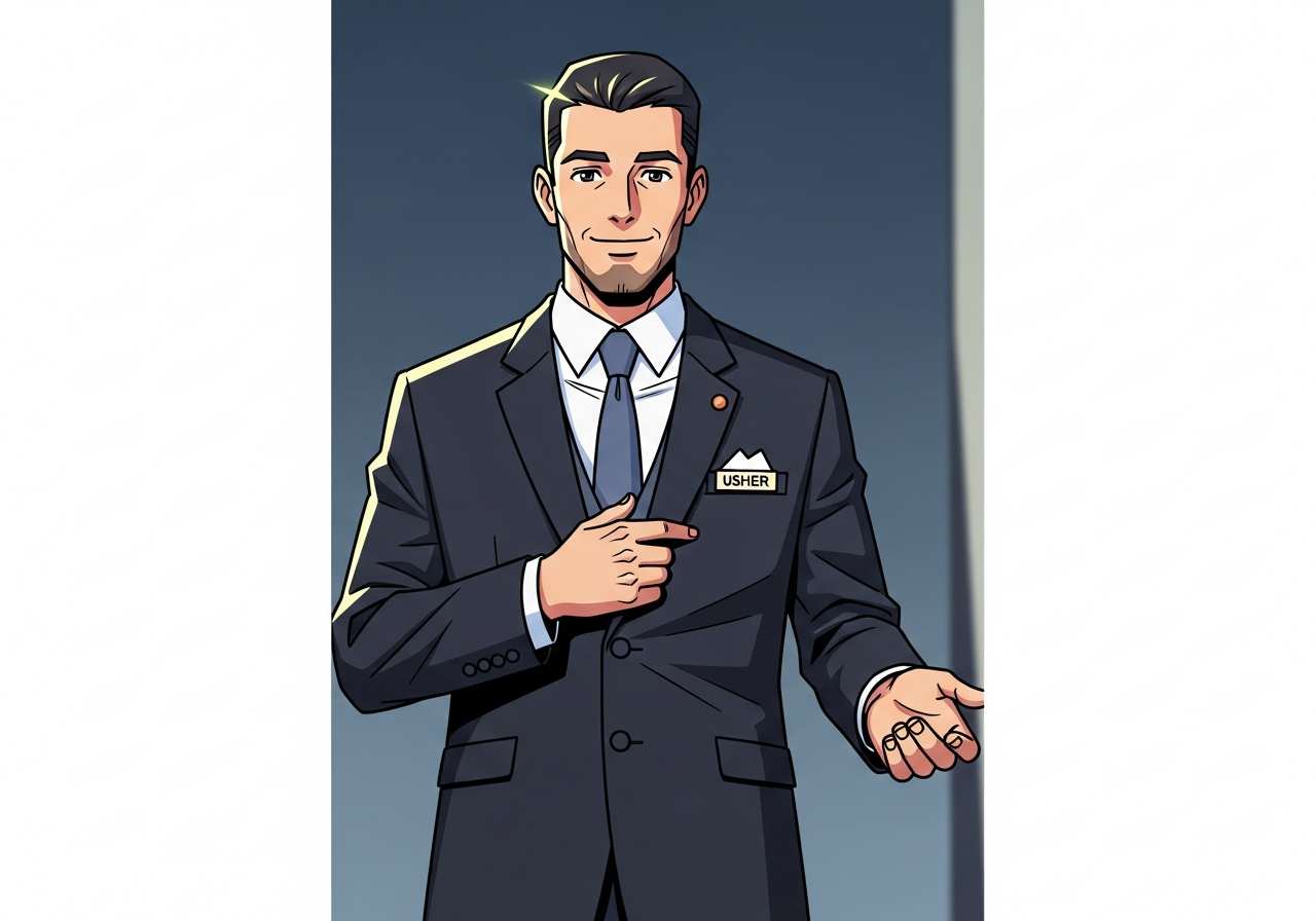 劇場や結婚式などで人々を席に案内する係員を指します。動詞として「案内する」という意味でも使われます。