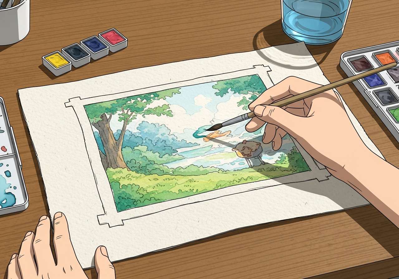 水で溶かして使う絵の具、またはその絵の具で描いた絵のこと。透明感のある表現が特徴です。