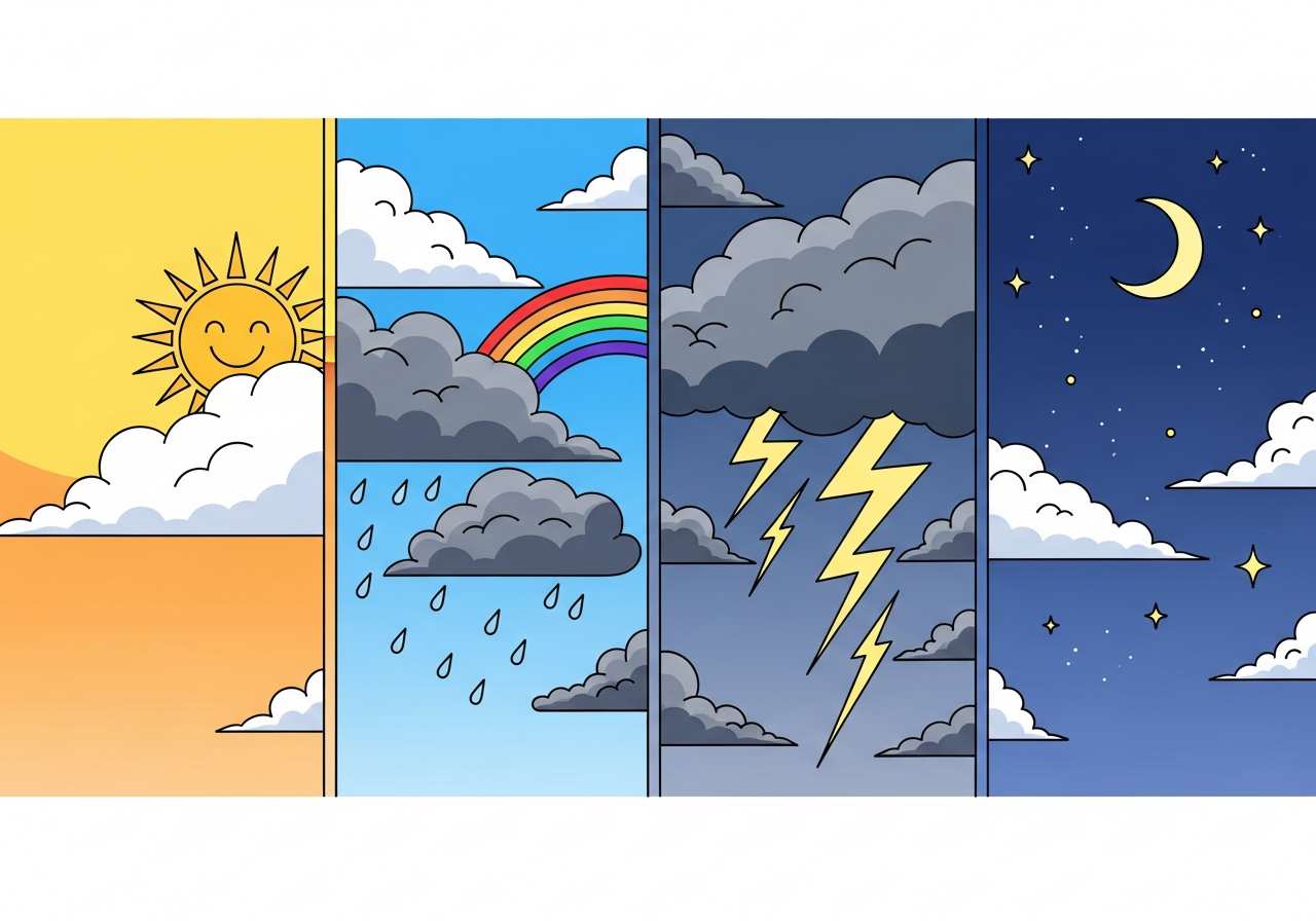 「weather」は天気や気象状態を表す基本的な英単語です。日常会話で頻繁に使用され、晴れ、雨、雪、風などの大気の状態を指します。