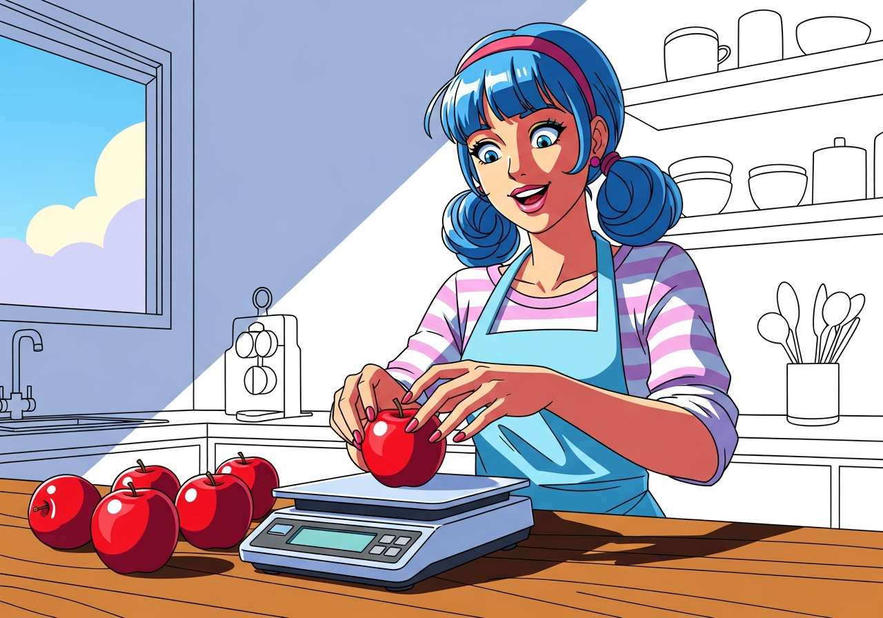 彼女はキッチンのはかりでリンゴの重さを量った。