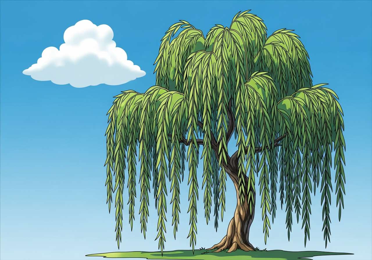 柳(やなぎ)は、細長い葉と垂れ下がる枝を持つ落葉樹です。水辺に多く生育し、しなやかな枝が特徴的です。