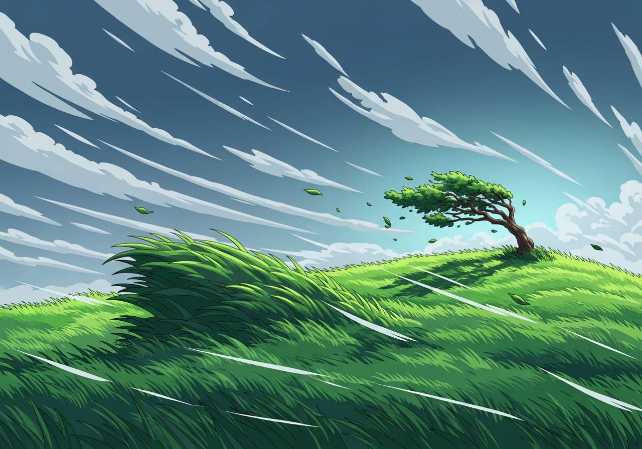 風が強い状態を表す形容詞。天気や場所の描写によく使われます。